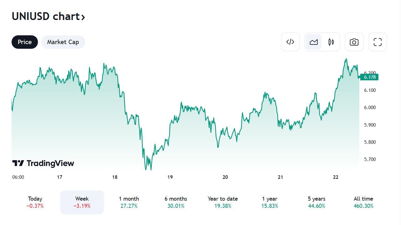 Cena UNI waha się od 4,45 $ do 7,03 $. 10-dniowa średnia krocząca wynosi 6,10 $, a 100-dniowa średnia krocząca 5,00 $, co wskazuje na pozytywny trend.