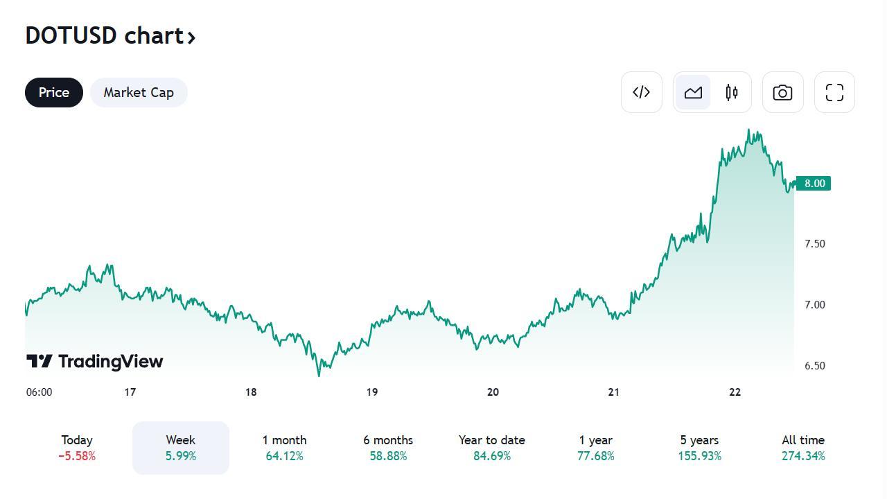 Polkadot cieszy się coraz większym zainteresowaniem inwestorów, a jego cena niemal podwoiła się w ostatnich miesiącach. Wzrost ten odzwierciedla szerszy wzrost na rynku kryptowalut i rosnącą atrakcyjność altcoinów.