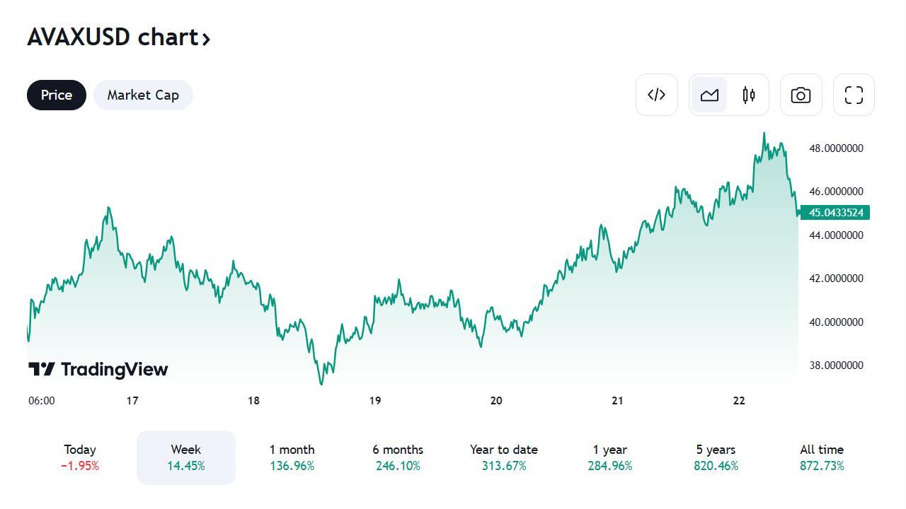 Cena AVAX waha się od 43,58$ do 47,83$. 10-dniowa średnia krocząca wynosi 47,87$, a 100-dniowa średnia krocząca 46,00$, co sugeruje zmienny, ale wzrostowy trend.