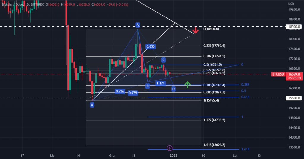 Patrząc na niższy interwał czasowy – dzienny – spodziewane jest zejście w najbliższych dniach do okolic 16100$. W tym rejonie możliwy jest wypełniony układ harmoniczny z punktem D na poziomie 0.786. Pokrywa się to również z mierzeniem korekty 0.382, co daje większe potwierdzenie. W dalszej perspektywie na ten moment największym zasięgiem potencjalnych przyszłych wzrostów jest dalej aktualny poziom 18500$. Jest to miejsce gdzie zbiega się linia tendencji spadkowej na wyższym interwale czasowym, linia oporu oraz górne ograniczenie niedawno przebitego lokalnego trendu wzrostowego. Jednak trzeba pamiętać, na ten moment nie widać choćby przesłanek sugerujących większy wzrost w najbliższej przyszłości.