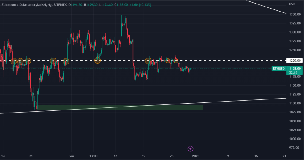 Z kolei na wykresie 4-godzinnym widać jak w ostatnim czasie cena ETH respektuje obecną linię oporu 1220$. Biorąc pod uwagę cały czas sentyment spadkowy na rynku, możliwe jest odwiedzenie czystej strefy popytowej 4-godzinnej, utworzonej w listopadzie. Jest to również dolne ograniczenie wcześniej wspomnianego trójkąta, więc bardzo prawdopodobna jest reakcja wzrostowa w tym miejscu, przynajmniej chwilowa, przed ewentualnymi dalszymi spadkami (w długim terminie).