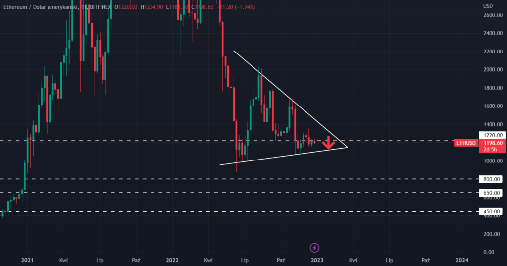 Ethereum (ETH) podobnie jak główna kryptowaluta BTC odnotowuje słaby rok. Gdyby spojrzeć na wykres tygodniowy widzimy możliwy do zrealizowania scenariusz niedźwiedzi (flaga spadkowa) – sugerujący w najbliższym czasie wybicie z trójkąta i kontynuacja spadków. W dłuższym terminie kolejnymi strefami wsparcia są poziomy 800$, 650$ oraz 450$. Gdzie będzie dołek? Tego nie wie nikt, jednak są to wartości warte obserwacji.