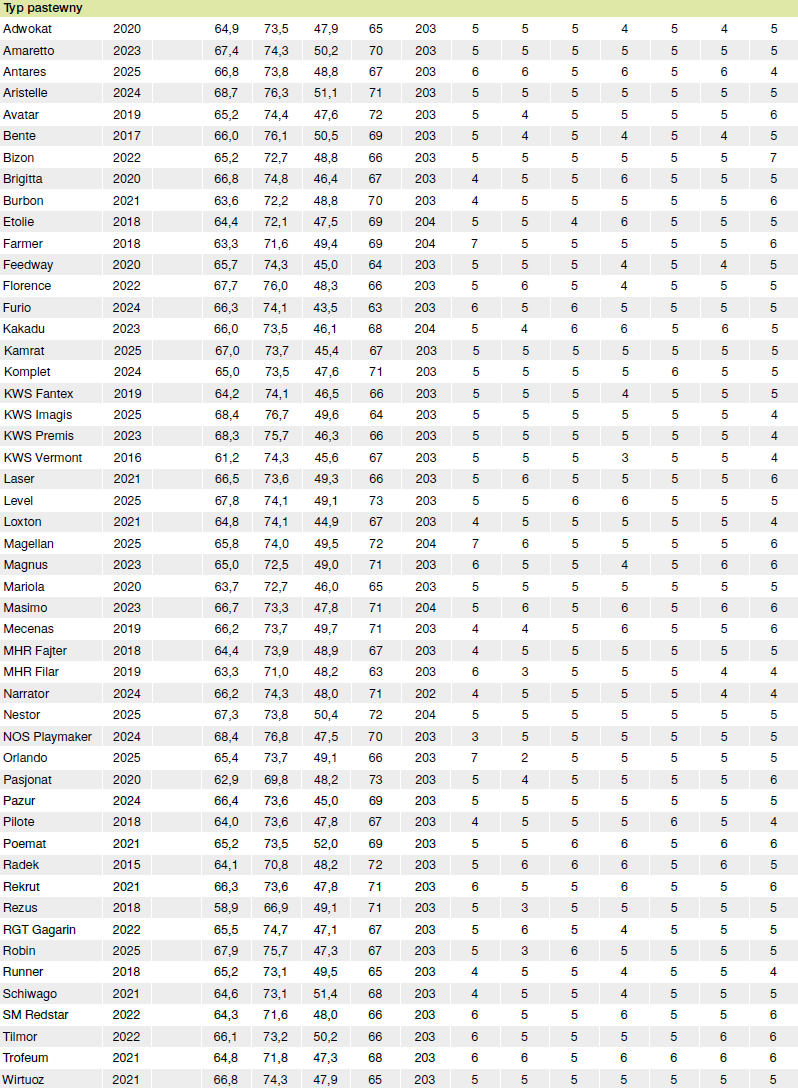W 2025 roku plonowanie odmian wzorcowych (Aristelle, LG Flamenco i Tilmor) było wyraźnie wyższe niż w latach poprzednich – uzyskano średnio 76,3 dt/ha ziarna na poziomie przeciętnej agrotechniki oraz 84,0 dt/ha przy technologii intensywnej. Pokazuje to, iż odpowiednio dobrana kreacja pozwala w praktyce produkcyjnej skutecznie wykorzystać potencjał plonowania potwierdzony w doświadczeniach.