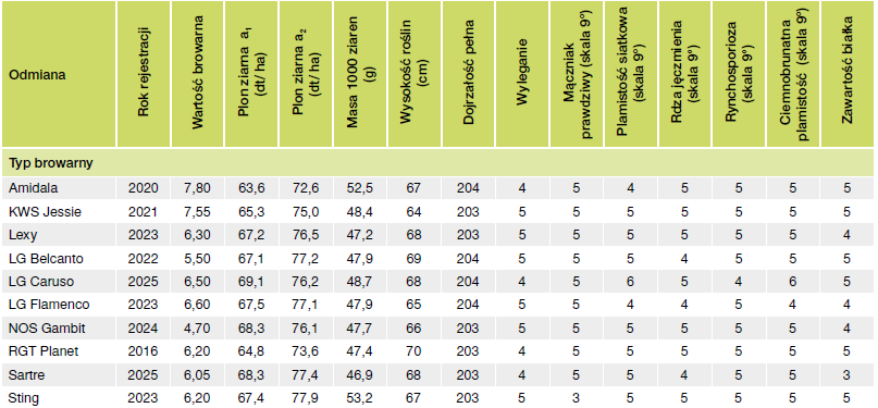Jęczmień jary: ważniejsze cechy rolniczo-użytkowe odmian (wg COBORU)