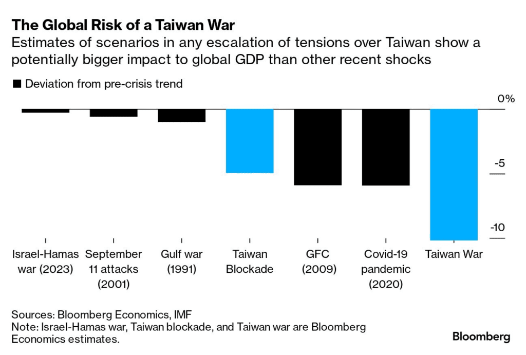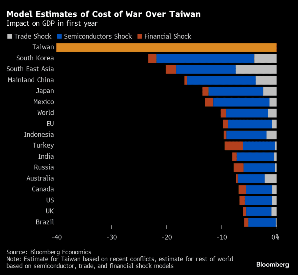 — Tracy (𝒞𝒽𝒾 ) (@chigrl) January 17, 2024Nic dziwnego, iż inwestorzy nie chcą ryzykować na chińskie akcje, w czasie gdy szanse na inwazje lub blokadę Wyspy rosną. Co taki scenariusz mógłby oznaczać dla gospodarki świata i Chin? Oto, co szacuje Bloomberg. Z punktu widzenia gospodarki światowej i rynków finansowych zwycięstwo dwóch, pozostałych kandydatów na prezydenta Tajwanu było korzystniejsze. Stany nie dostałyby do ręki 'mandatu’ obecności polityczno-militarnej na i wokół wyspy. Pekin za to mógłby kontynuować 'demokratyczny’ sposób oderwania wyspy z rąk Zachodu. Lub co najmniej jej 'odpolitycznienia’.
