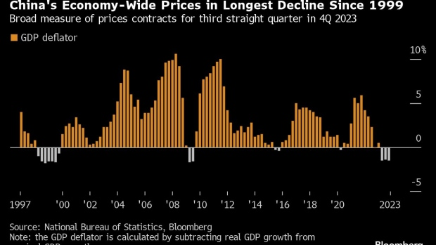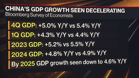 Źródło: BloombergAnkietowani przez Bloomberg ekonomiści oczekują dalszego spowolnienia w Chinach i redukują poprzednie oczekiwania. Do 2025 roku wzrost gospodarki ma zwolnić do 4,6%. Nominalnie liczby wzrostu w ujęciu rocznym wciąż robią wrażenie ale warto pamiętać, że… Porównanie dotyczy roku 2022, gdy gospodarka była w pandemii. Jeszcze na początku 2023 słychać było prognozy, iż PKB może wrosnąć dwucyfrowo, gdy na rynek wejdzie uśpiony popyt konsumentów. Tymczasem mamy… Deflację, ceny w ujęciu rocznym spadają od 3 miesięcy. Bank centralny utrzymuje stopy bez zmian od 5 miesięcy, prowadząc inwestorów do rezygnacji spowodowanej brakiem szeroko oczekiwanego 'stimulusa’.