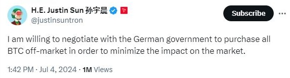 O swojej decyzji Sun poinformował w poście opublikowanym dziś na platformie X. „Jestem skłonny negocjować z niemieckim rządem zakup wszystkich BTC poza rynkiem, aby zminimalizować wpływ na rynek” – to treść jego komunikatu.