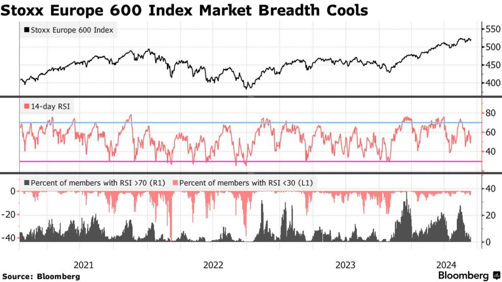 Europejskie indeksy zlapały zadyszkę, po tym jak wyniki wyborów do Europarlamentu wskazały na rosnące poparcie dla prawicowych partii. Rynek widzi to jako wzrost niepewności i wewnętrznych napięć w wielu gospodarkach Starego Kontynentu. Źródło: Bloomberg