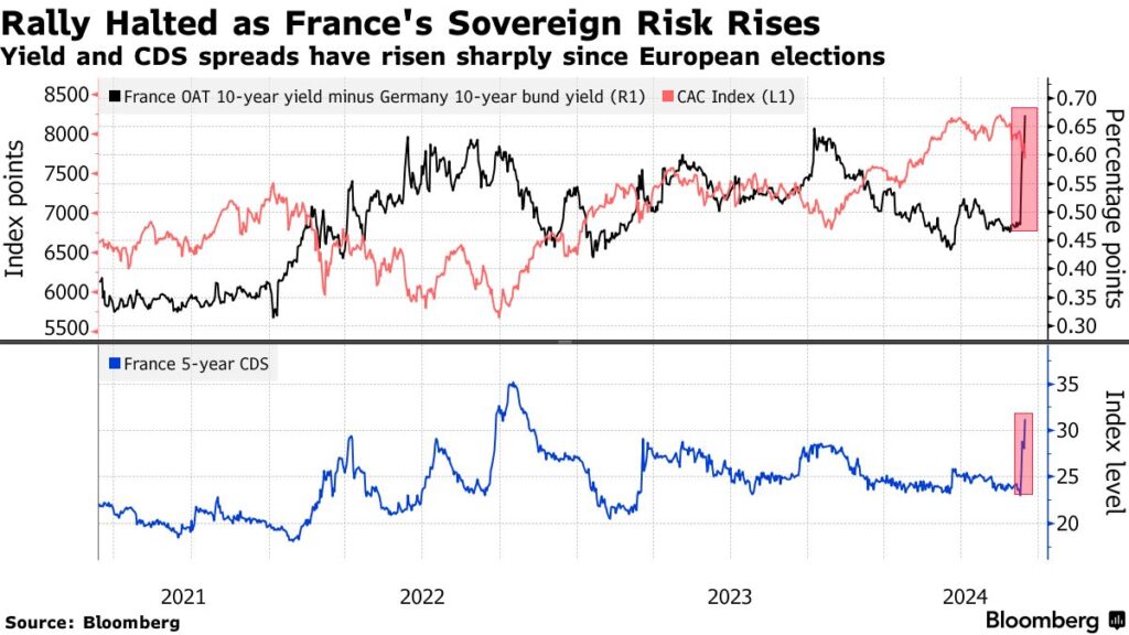 Różnica w oprocentowaniu francuskich i niemieckich obligacji dynamicznie wzrosła, podobnie jak CDS-y na francuski dług. Około 51% długu Francji posiadają zagraniczni inwestorzy. Powód niepewności? Przyspieszone wybory i niepokoje wewnętrzne. Źródło: Bloomberg