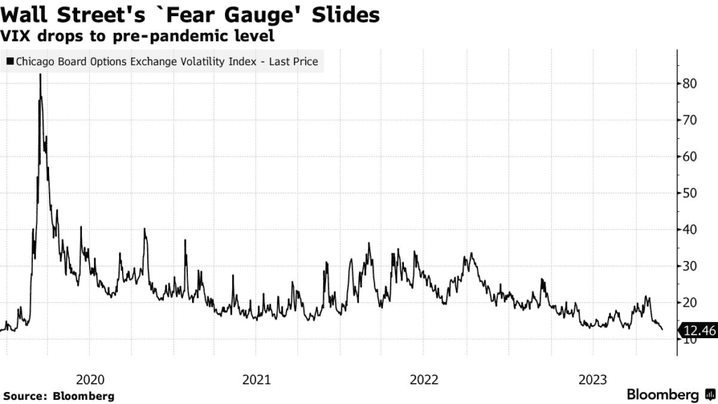 Gdy rynek akcji zbliża się do szczytów indeks VIX zmienności S&P 500, VIX (zwany także indeksem strachu) znalazł się na rekordowo niskim poziomie od 2020 roku. Premia za ryzyko dla kupujących niedźwiedzie kontrakty? Źródło: Bloomberg