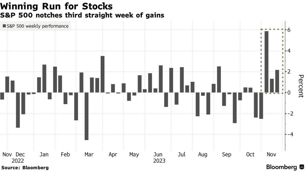 Listopad przyniósł rynkowi akcji choćby nie 3 ale 4 tygodnie wzrostów. Czy grudzień przedłuży tą passe? Źródło: Bloomberg