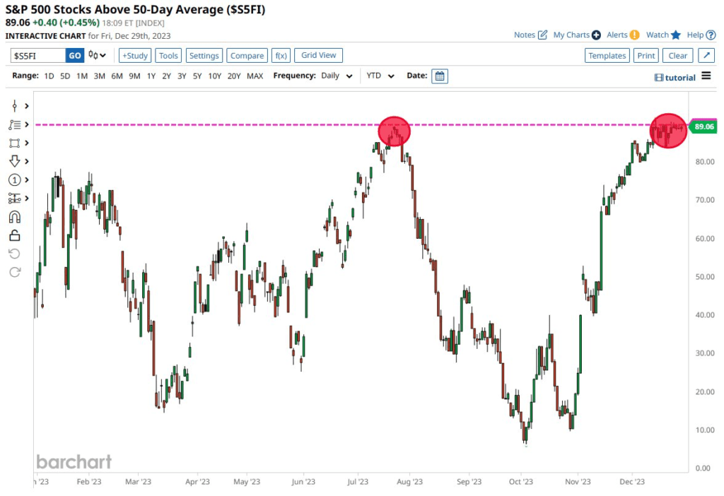 89% społek z S&P 500 notowane jest w tej chwili powyżej 50 dniowej średniejkroczącej. Ostatnio taka sytuacja miała miejsce między lipcem a sierpniem 2023 roku. Pozostali 'maruderzy’ dołączą do rajdu, czy może realizacja zysków zepchnie główny benchmark z historycznych maksimów? Źródło: Barchart
