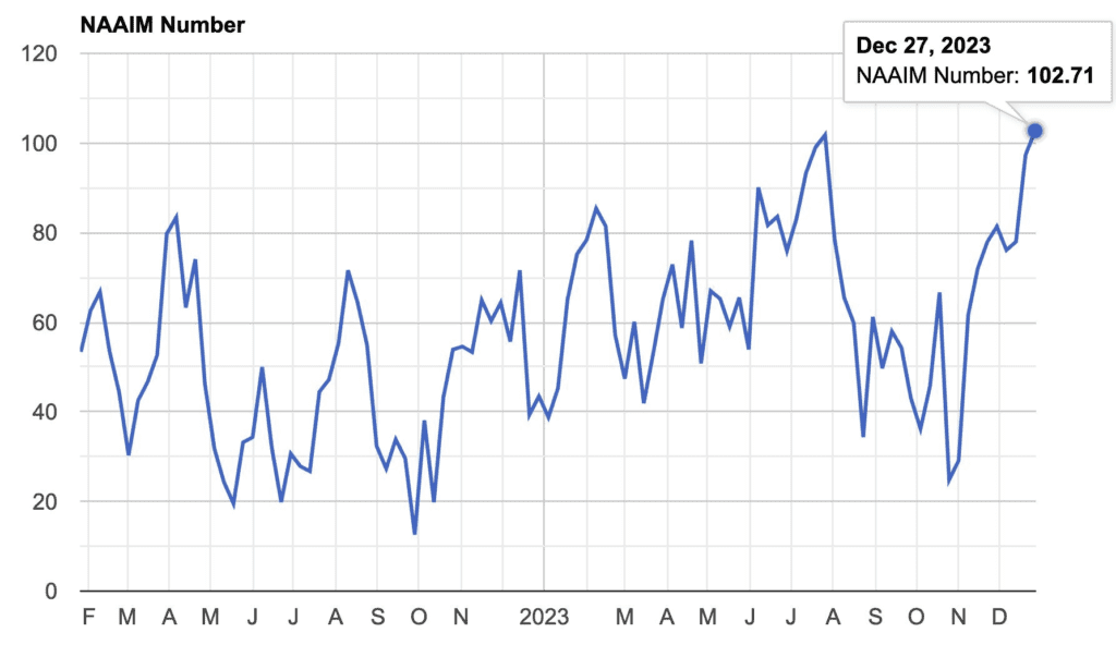 Zarządzający inwestycjami deklarują rekordowe, bycze pozycjonowanie na rynku akcji (National Association of Active Investment Managers tzw. NAIIM index). Źródło: Barchart