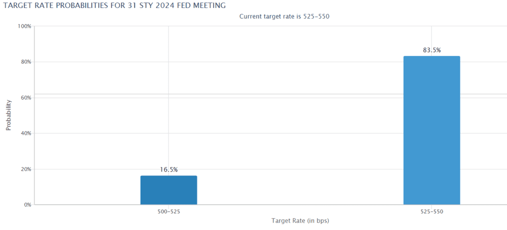 Po serii słabszych danych makro z USA, wyceniane szanse pierwszej wobec obniżki stóp Fed, na posiedzeniu 31 stycznia wzrosły o 2%, względem poprzedniego tygodnia. Wynoszą w tej chwili 16,5%. Źródło: CME, Fed Watch