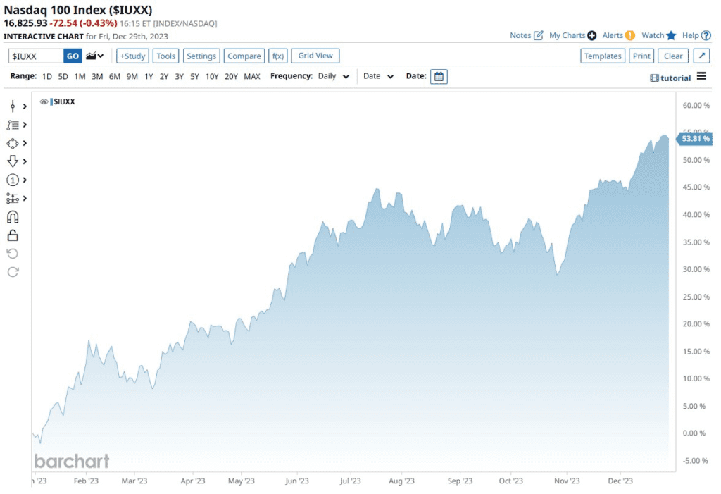 Nasdaq zamyka rok 54% wyżej. To rekordowy roczny yield od 1999 roku – początku dotcomowej hossy. Tymczasem Dow Jones notuje rekordową wzrostową passę, od 2019 roku. Źródło Barchart