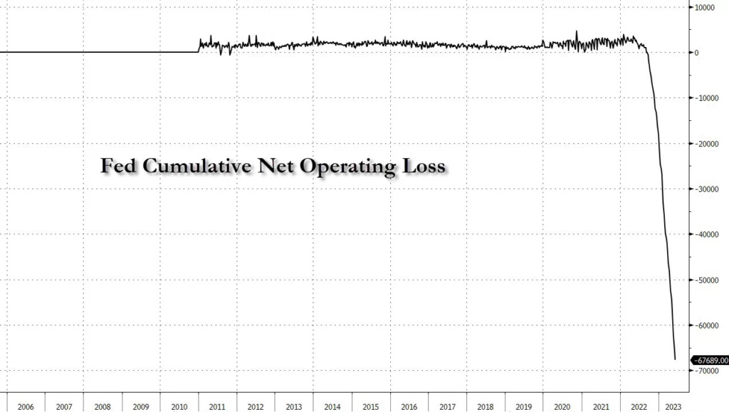 Operacyjna strata Fed wynosi w tej chwili prawie 68 mld USD. Rezerwa Federalna każdego dnia płaci 800 mln USD odsetek bankom i funduszom rynku pienięznego (dane bez rynku reverse repo i IOR). Źródło: ZerohedgeCo z Fedem?