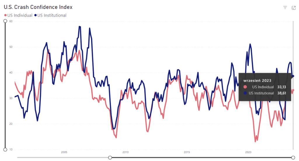 Wskaźnik krachu wg. indeksu Schillera jest wyższy dla inwestorów instytucjonalnych i w grupie tej zaczął szybciej spadać – inwestorzy detaliczni pozostają bardziej optymistyczni? Źródło: Yale University
