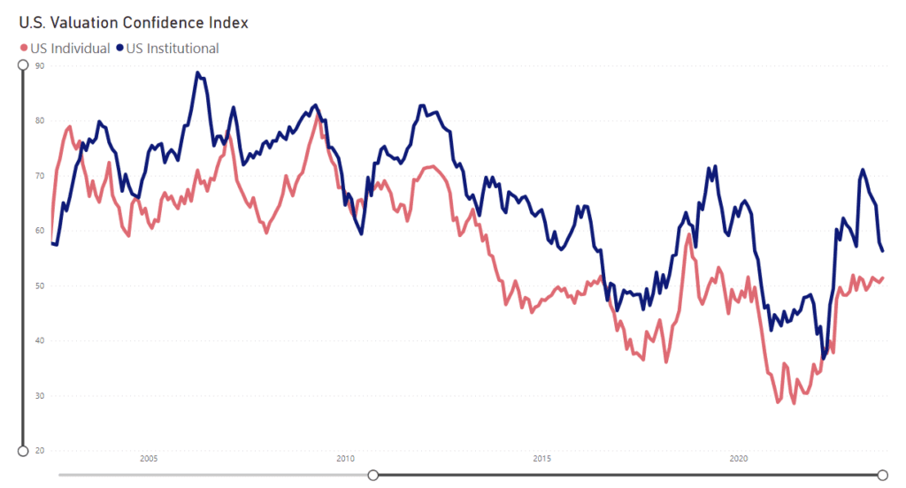 Indeks pewności wycen wg. indeksu Schillera wśród inwestorów instytucjonalnych konsekwentnie spada od kwietnia 2023 roku w czasie, gdy inwestorzy detaliczni pozostają relatywnie optymistyczni względem obecnych poziomów cen akcji. Źródło: Yale University