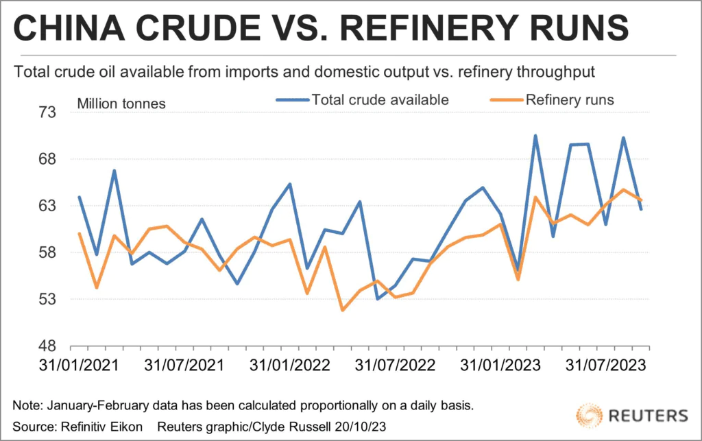 Przede wszystkim rynki 'grając’ na wyższe ceny czarnego złota nie doceniły aspektu Chin. Najnowsze dane wskazują, iż we wrześniu import ropy spadł w środowisku teoretycznie wyższej konsumpcji co rynek odczytuje jako sygnał niższego popytu. Co więcej dane alternatywne wskazują na bardzo wysokie zapasy ropy w Chinach, które w ostatnich miesiącach były przez nie intensywnie budowane. Sytuacja na rynku chińskim nie sprzyja wyższym globalnie cenom ropy, gospodarka wyraźnie stoi przed perspektywą niższego zapotrzebowania – w środowisku olbrzymich zapasów, których budowa została już przez rynek zdyskontowana w cenach, w ostatnich miesiącach. Wszystko to w czasie gdy implikowany popyt na benzynę w Stanach spadł ostatnio do rekordowego minimum… Od 20 lat. Co więcej, blokada cieśniny Ormuz przez Iran nie wydaje się prawdopodobna. Byłaby negatywna – głównie dla samego Iranu i Chin ponieważ to przez nią kraj wysyła ropę do aktualnie największego klienta – Stany Zjednoczone utrzymują embargo w mocy. Podsumowując – premia geopolityczna stopniowo zwalnia a bieżąca koniunktura globalna (jak i oczekiwana) sprzyjają presji spadkowej na ropie. To dobrze dla rynku akcji.