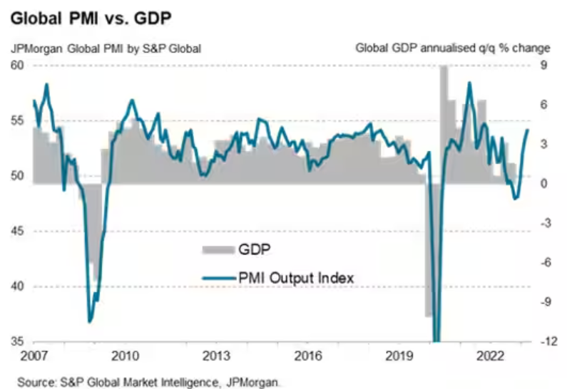 Źródło: S&P Global, JP MorganGlobalny indeks produkcji J.P.Morgan opracowywany przez analityków S&P Global wyniósł w kwietniu 54,2 wobec odczytu 53,4 w marcu. Oznacza to trzecią z rzędu miesięczną ekspansję globalnej gospodarki. To oznacza najszybsze tempo od grudnia 2021 roku. Najnowszy odczyt wskazuje, iż globalny PKB wzrósł w ujęciu kwartalnym oraz w ujęciu rocznym o blisko 4%. Recesja nie wydaje się więc przesądzona. Być może Powell z Fed ma rację optymistycznie wierząc, iż Stanom Zjednoczonym uda się jej uniknąć?