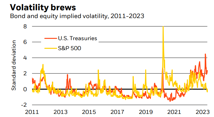 Implikowana zmienność rynku akcji i obligacji. Portfolio 40/60 nie zdało egzaminu – obligacje nie 'zabezpieczyły’ przed skokiem zmienności akcji w 2022 roku. Źródło: BlackRock