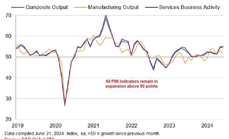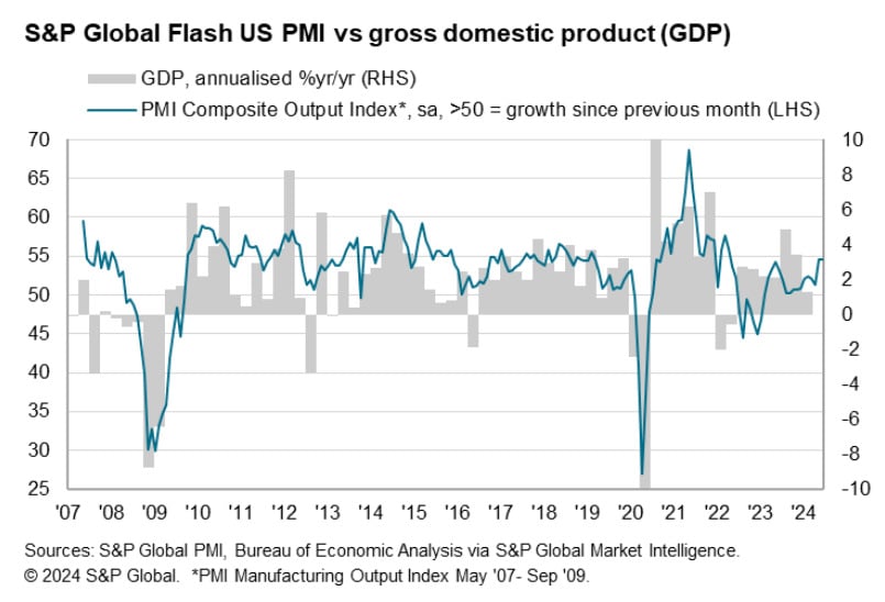 Ostatnie dane z przemysłu wypadają nieco słabiej, od indeksów aktywności biznesowej w Stanach, ale wciąż bardzo solidnie. Źródło: S&P. FXStreet
