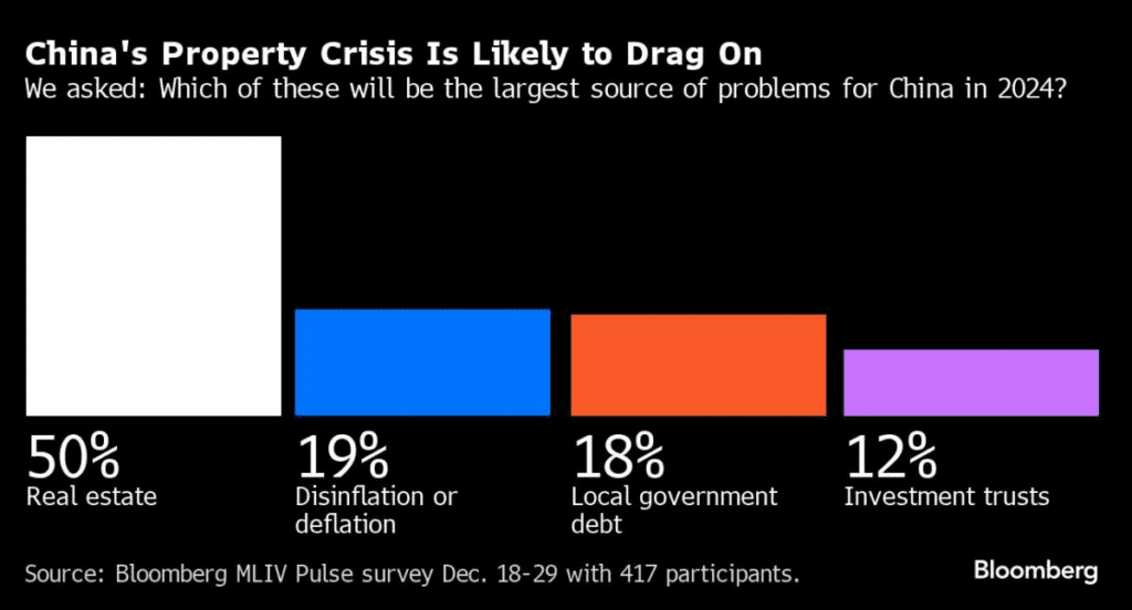 Najwiekszym problemem systemowym Chin są nieruchomości. Tylko 12% zasugerowało, iż to zaufanie inwestorów. Dane z ankiety Bloomberg (28-29 grudnia), na grupie 417 ekonomistów.Kalendarz ekonomiczny: