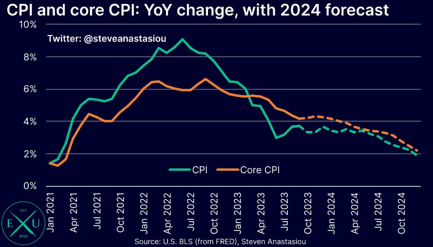 Gospodarka Chin walczy z wieloma problemami. Te od miesięcy widoczne są, w notowaniach Hang Seng. Zatem czy partia ogłosi mocniejszy program pomocowy w 2024 roku? Czy PBoC dostosuje politykę do nadzwyczajnej sytuacji? Z kolei Stany Zjednoczone, w przeciwieństwie do Chin zachęcają globalny kapitał, do inwestycji w akcje. Prognozy Bloomberga, jak i aktualne sugerują inflację w celu, jesienią 2024 roku. Czy taki scenariusz się ziści? Tego nie wiemy, ale odczyt w przyszłym tygodniu może stanowić dla rynku sygnał, czy oczekiwania na rok 2024 są w pełni uzasadnione.