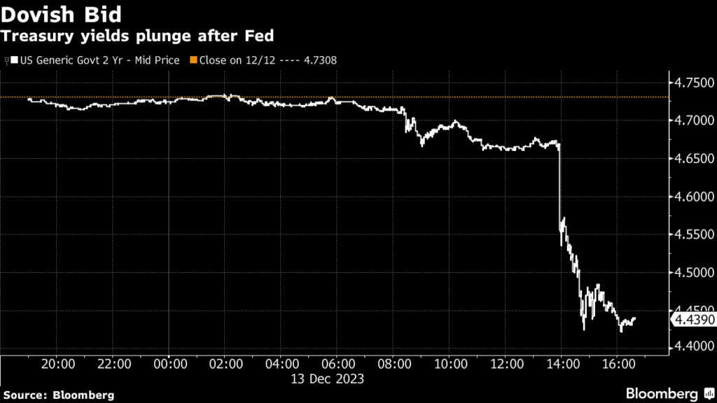 Rentowności załamują się pod presją pivotu w polityce monetarnej Rezerwy Federalnej. Inwestorzy obawiają się, iż bezpieczne aktywa znów będą płacić im żałośnie mało. W efekcie ma miejsce migracja kapitału do ryzykownych aktywów jak akcje, obligacje czy kryptowaluty. Źródło: Bloomberg
