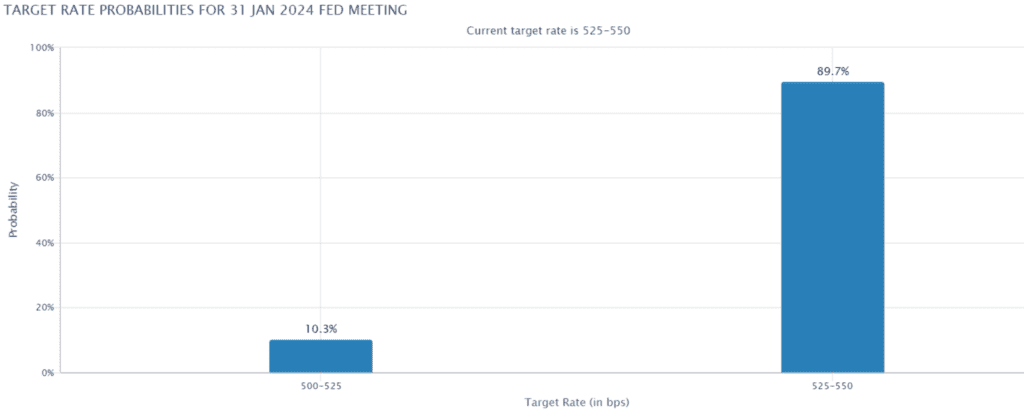 Rynki wyceniają ponad 10% szans na obniżkę stóp na posiedzeniu Fed, 31 stycznia 2024 roku. Jest to pierwsza sytuacja, w której rynki widzą szanse na obniżkę od kilkudziesięciu miesięcy. Źródło: CME, FedWatchKalendarz ekonomiczny