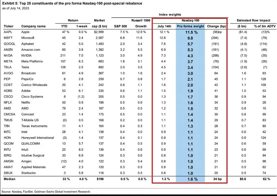 Źródło: Goldman Sachs ResearchPowyższy wykres przedstawia nowe wagi spółek w indeksie Nasdaq po 'rebalancingu’, którego celem było obniżenie wagi indeksowej dominujących, największych techów. Dominację w benchmarku odzyska Apple.