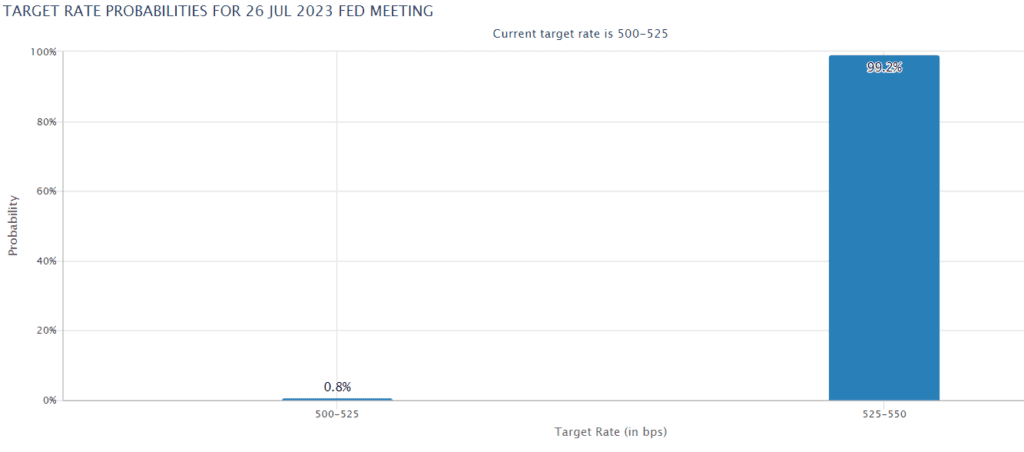 Rynek jest niemal pewien kolejnej, 25 pb podwyżki stóp Fed – jakakolwiek inna decyzja byłaby olbrzymim zaskoczeniem i jest mało prawdopodoba. W naszej ocenie możliwa kolejna pauza mogłaby doprowadzić jedynie do krótkotrwałej euforii rynków ponieważ historycznie pivot Fed zwiastował głębokie problemy realnej gospodarki. Spekulanci skoncentrują się przede wszystkim na komentarzach Jerome’a Powella, zagrożeniu recesją oraz oczekiwaniach dot. dalszej trajektorii polityki monetarnej w Stanach. Najbliższy tydzień może okazać się najważniejszy dla momentum indeksów w drugiej części roku.