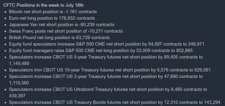Zmiany pozycji spekulacyjnych wg. CFTC w tyg. skończonym 18 lipca. Źródło: CFTCSpekulanci nieustannie pozycjonują się w kontrze do byków na S&P 500. Widać też bardzo bycze pozycjonowanie na Bitcoinie, franku i japońskim jenie. Dolar wciąż jest sprzedawany choć ostatnie dane Bank of America wskazały na spore napływy do gotówki przy jednoczesnym odwrocie z rynku akcji.