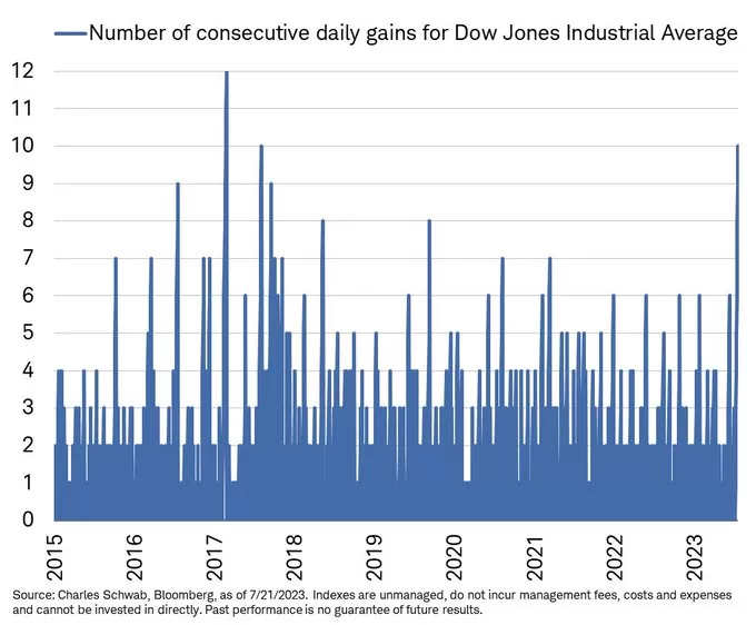 Źródło: Bloomberg,Charles SchwabRynek akcji ma za sobą szalony okres, a indeks Dow Jones zyskiwał w ostatnim czasie 10 dni z rzędu podobna passa ostatio miała miejsce blisko 5 lat temu, w roku 2018. Z drugiej strony jest to pośredni wynik wciąż dość mocnych danych z gospodarki, nadziei na miękkie lądowanie oraz relatywnie słabego sentymentu na indeksie od początku roku. Inwestorzy z techów znów przesiądą się do spółek 'starej gospodarki’?