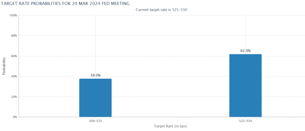 Oczekiwania rynku sugerują 38% szans na obniżkę stóp 20 marca. Większość oczekuje cięć dopiero w maju. Kluczową rolę mogą odegrać banki. Źródło: FedWatchKalendarium