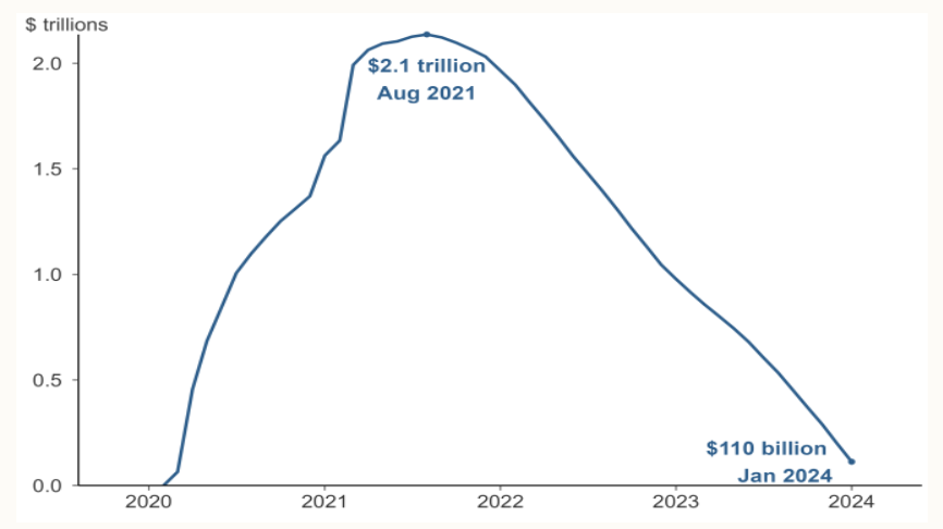 Łączna nadwyżka oszczędności w okresie pandemii i po niej. Miesięczna kumulacja nadwyżki oszczędności od początku recesji w 2020 roku. Najnowszy punkt to szacunkowy zapas nadwyżki oszczędności w zagregowanej gospodarce USA. Źrodło: Federal Reserve