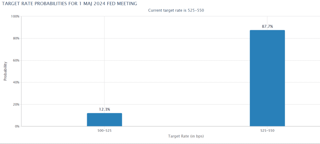 Prawdopodobnie w takim scenariuszu Wall Street zaczęłoby wyceniać tylko dwa cięcia stóp, wobec trzech obecnie. Szanse na obniżkę stóp Fed w maju (obecnie wyceniane z 17% prawdopodobieństwem) spadłby do zera, umacniając dolara i rentowności. Z drugiej jednak strony dane PCE zgodne, lub zaskakująco niższe, od prognoz prawdopodobnie doprowadzą rynki do dalszej euforii, wspierając Wall Street i kryptowaluty.