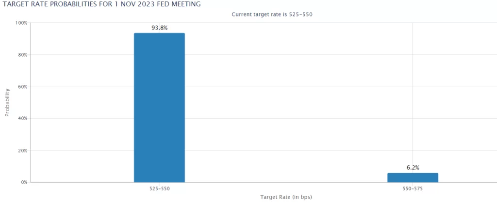Rynek daje 93% szans na utrzymanie stóp Fed bez zmian na posiedzeniu w listopadzie. Źródło: CME FedWatch