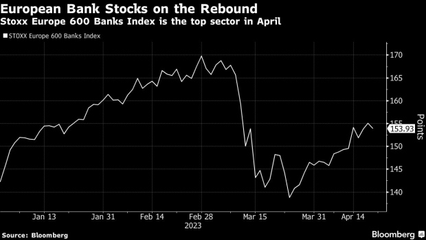 Akcje europejskich banków z indeksu Stoxx Europe 600 są blisko szczytów odkąd odbiły w drugiej połowie marca. Czy urzymają spadkową linię trendu? Źródło: BloombergKalendarium