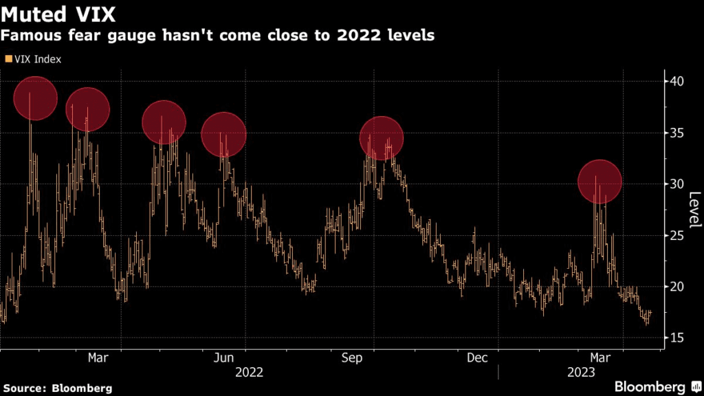 Indeksch strachu tzw. VIX notuje coraz niższe szczyty od początku 2022 roku. w tej chwili znajduje się na relatywnie niskich poziomach obrazując wyciszoną zmienność na S&P500. Cisza przed burzą? Źródło: Bloomberg