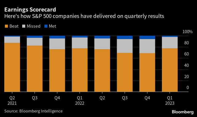 Popatrzymy na ostatnie kwartały. Q1 2023 to w tym zestawieniu ostatni kwartał 2022 roku. Co prawda więcej spółek pokonało oczekiwania ale ilość tych, które się z nimi minęły wciąż wynosiła blisko 20%. Nie zapominajmy też, iż analitycy mają tendencję do stawiania poprzeczniki odpowiednio nisko, by kwartał otwierający nowy rok był dobry. Jak będzie wyglądał I kw. 2023? Źródło: Bloomberg