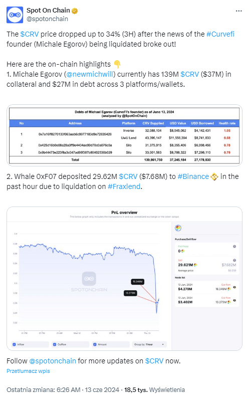 Otóż jest jednym z największych dostawców płynności DeFi. Szczególnie istotną rolę platforma pełni w odniesieniu do tzw. stablecoinów. Projekty DeFi świadczą różne usługi finansowe; szczególnie popularne są protokoły pożyczkowe. W efekcie wyprzedaż CurveDAO przełożyła się na spadki kilku innych projektów DeFi. Egorov utrzymywał zlewarowane pozycje otwarte od kilkunastu miesięcy 'prosząc’ się o taki rozwój zdarzeń. Wydarzenia z sierpnia 2023 roku kilka go nauczyły, a w sieci 'teorii spiskowych’ przybywa.