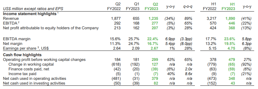 Mimo gorszej wydajności upraw oraz mniejszego areału spadek przychodów w pierwszym półroczu wyniósł 41% r/r. Natomiast wynik EBITDA spadł o 22%. Zatem spółce udało się poprawić rentowność na skutek działań redukujących koszty. W pierwszym półroczu marża EBITDA wyniosła 23,6%, czyli o 5,8 punktu procentowego więcej niż przed rokiem. Co ważne w tym półroczu spółka wygenerowała dodatnie przepływy z działalności operacyjnej na poziomie 348 mln$.