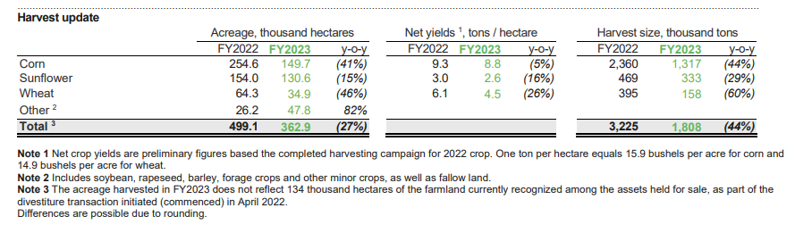 W lutym 2023 roku Kernel zakończył kampanię zbierania plonów. Z powodów wielu czynników niezależnych od spółki spadła wydajność uprawy kukurydzy. Osiągnęła ona poziom 8,8 ton na hektar, co było wynikiem o 5% niższym niż rok wcześniej. Warto zauważyć, iż ostateczny rezultat był lepszy od oczekiwań spółki, które wynosiły 8,5 ton na hektar. Powodem była łagodniejsza zima. Znacznie słabiej wypadła wydajność upraw słonecznika, która w ciągu roku obniżyła się o 16% do poziomu 2,6 tony na hektar. Z kolei wydajność uprawy pszenicy spadła o 26% w ciągu roku do 4,5 tony na hektar. Warto jednak zauważyć, iż znacznemu obniżeniu uległ areał przeznaczony pod uprawy. Najmocniej ucierpiała uprawa kukurydzy oraz pszenicy. Tam spadek areału wyniósł ponad 40%. To w połączeniu ze spadkiem wydajności z hektara spowodowało drastyczny spadek wielkości plonów.