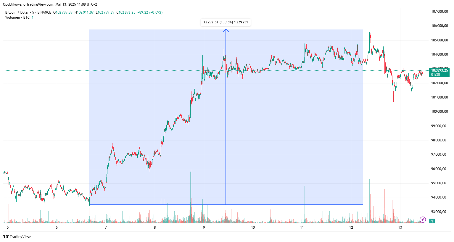 Bitcoin w przeciągu ostatniego tygodnia wzrósł na swoim wykresie cenowym o 13%, powracając do najwyższego poziomu cenowego od dnia 31 stycznia, wynoszącego 105 tys. dolarów.