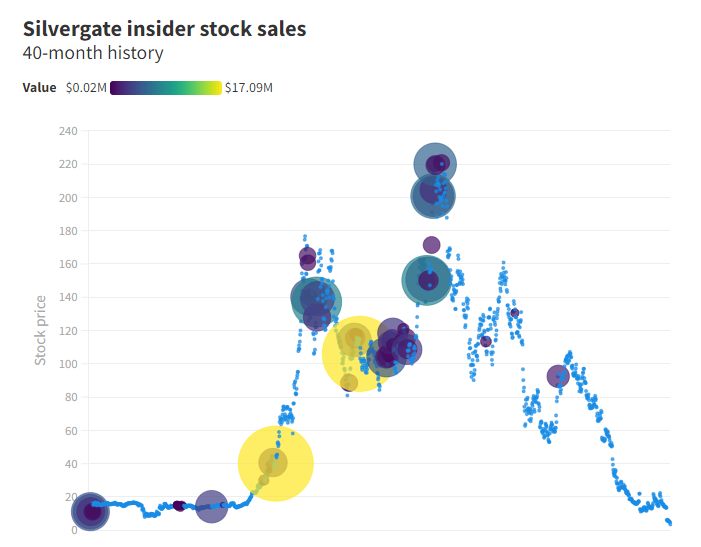 Kierownictwo kalifornijskiego banku Silvergate, pośrednika finansowego dla branży kryptowalut, który niedawno ogłosił bankructwo i przejście w stan likwidacji, sprzedało akcje o wartości w sumie ponad 103 milionów dolarów na szczycie hossy na rynku krypto. Były prezes Dennis Frank „wypracował” około 25% tej statystyki, sprzedając prawie 189 000 akcji w okresie od marca do listopada 2021 roku. Średnia cena sprzedaży prezesa Franka wyniosła 140 dolarów za sztukę. Inni insiderzy, którzy sprzedawali na szczycie, to wicedyrektor wykonawczy Derek Eisele, dyrektor generalny Alan Lane, główny strateg Ben Reynolds i dyrektor operacyjny Kathleen Fraher.