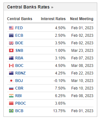 Rezerwa Federalna USA będzie podejmować decyzję w sprawie stóp procentowych, co będzie absolutnie centralnym wydarzeniem dla rynków. W grudniu Fed podniósł stopy procentowe o pół punktu procentowego, kończąc tym samym serię czterech kolejnych podwyżek o 0,75 p. proc. i sprowadzając stopę funduszy federalnych do docelowego przedziału 4,25%-4,5%. w tej chwili decydenci wydają się być podzieleni co do tego, czy podnieść stopy o kolejne 0,5 punktu procentowego, czy też ograniczyć się do podwyżki o ćwierć punktu.