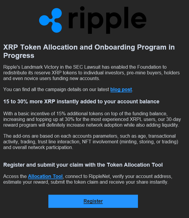 Okazuje się, iż spółka odpowiedzialna za niezwykle popularny ostatnio token XRP w wyniku niedawnego przełomu w procesie Ripple vs SEC (który wielokrotnie opisywaliśmy na łamach naszego portalu) planuje teraz RZEKOMO odblokować zamrożone rezerwy i rozdzielić posiadane przez siebie aktywa cyfrowe pomiędzy „inwestorów indywidualnych”. Wszystko w celu przyspieszenia masowej adopcji. Brzmi zbyt pięknie żeby było prawdziwie? A więc najprawdopodobniej prawdziwie nie jest.