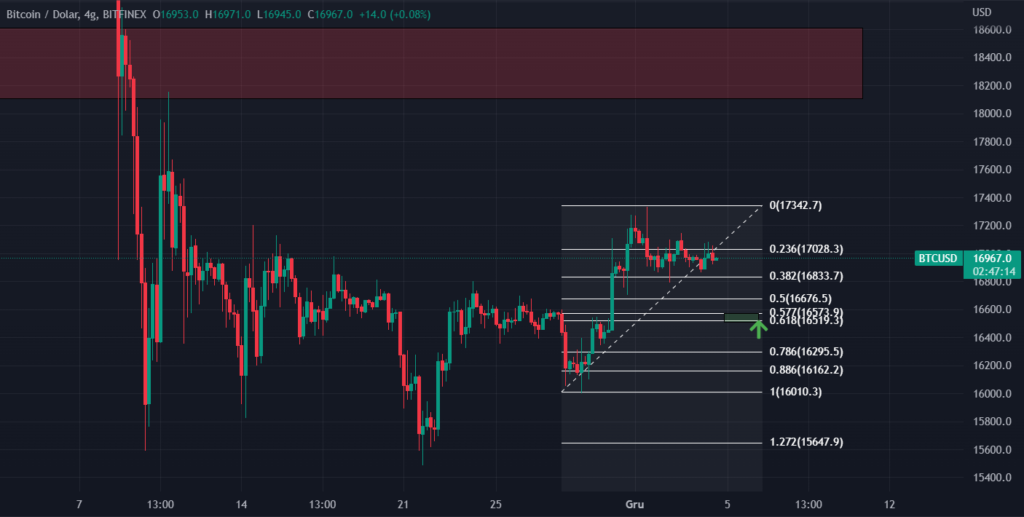 Bitcoin (BTC) w ostatnich dniach, od 21 listopada, notuje coraz wyższe szczyty. 21 listopada cena odnotowała wartość w okolicach 15500$, co jest najniższą wartością podczas obecnej bessy. Bitcoin bardzo często reaguje na poziomy Fibonacciego, a głównie 0.618 – i przy ewentualnej korekcie, przy tej wartości można wyszukiwać kolejnego dalszego odbicia wzrostowego w kierunku 18000$. Potencjalną wartością odbicia są okolice 16500$.