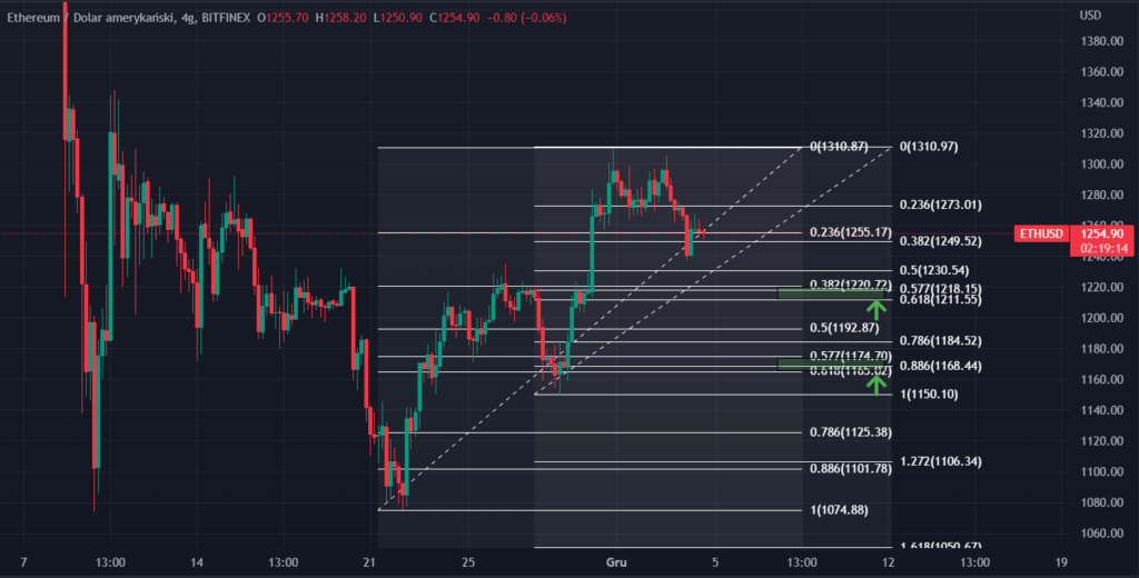 Ethereum (ETH) przy analizie mierzeń Fibonacciego może zanotować najpierw korektę do okolic 1220$ lub 1160$ – i z tych wartości odbić choćby w kierunku 1400$.